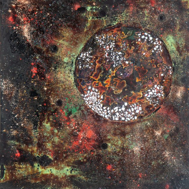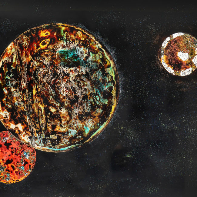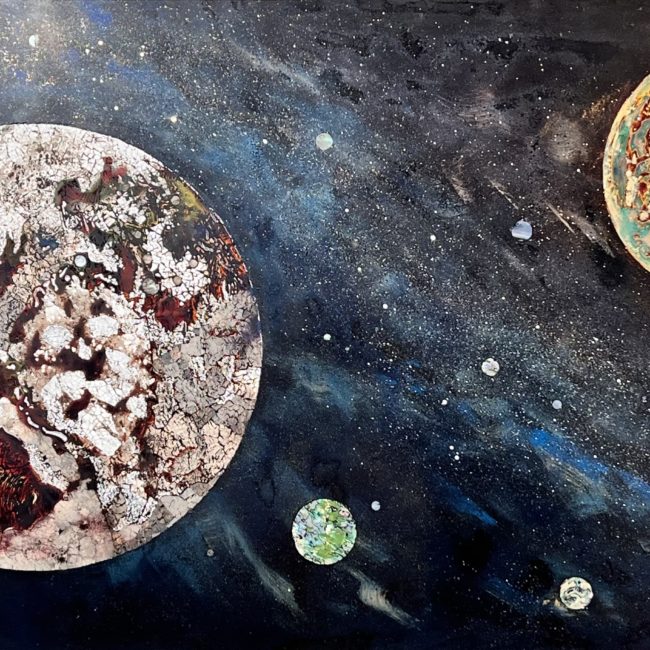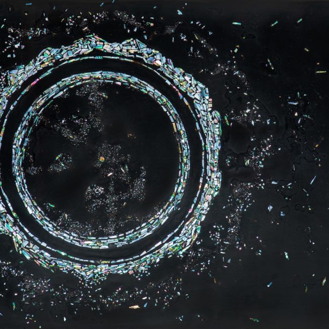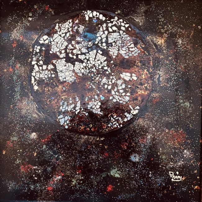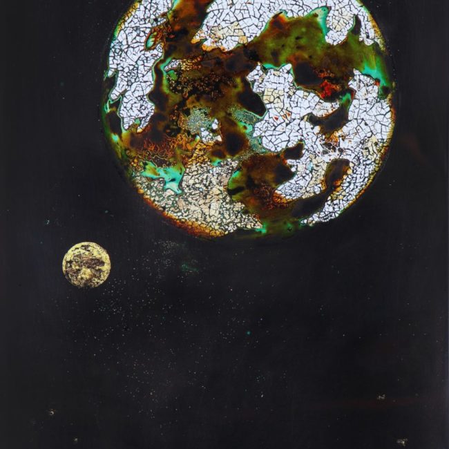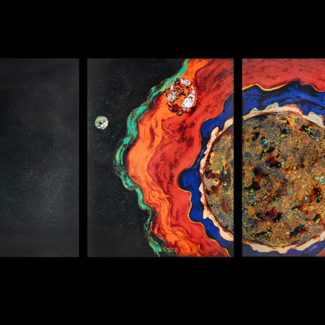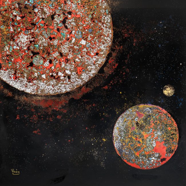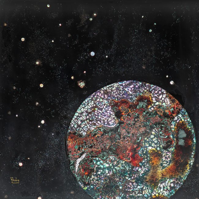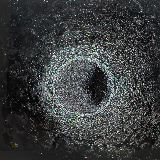 Thuy’s paintings are very much influenced by music and nature. You can see the orchestra of life created by a fun-and-stun process of using breathtaking and original techniques and materials. These include eggshell, mother of pearl, silver and gold leaves. These materials are rubbed with sand paper until the colours and textures burst out of the surface, layer by layer.