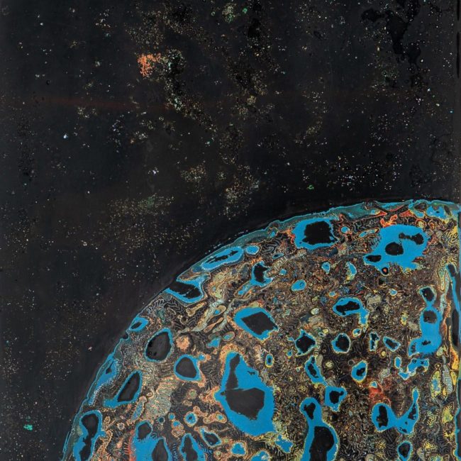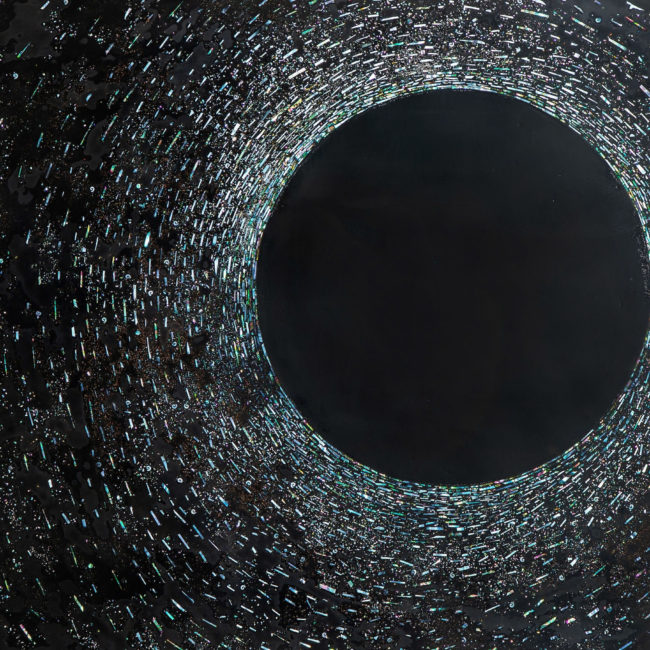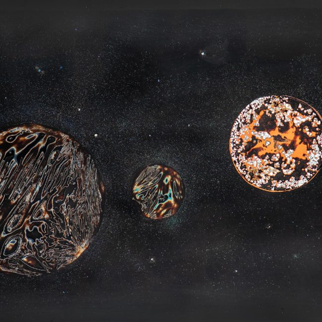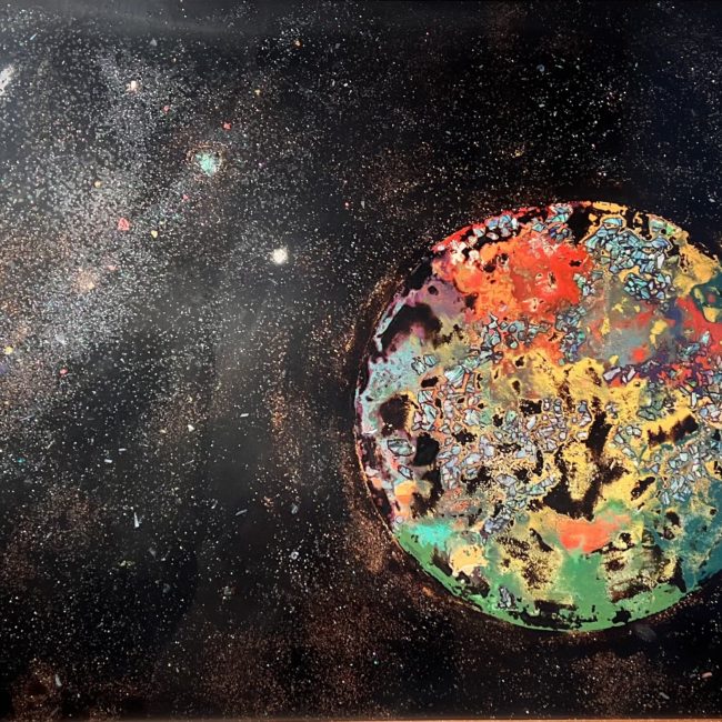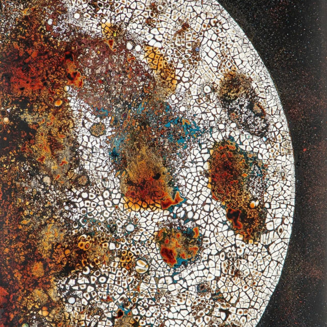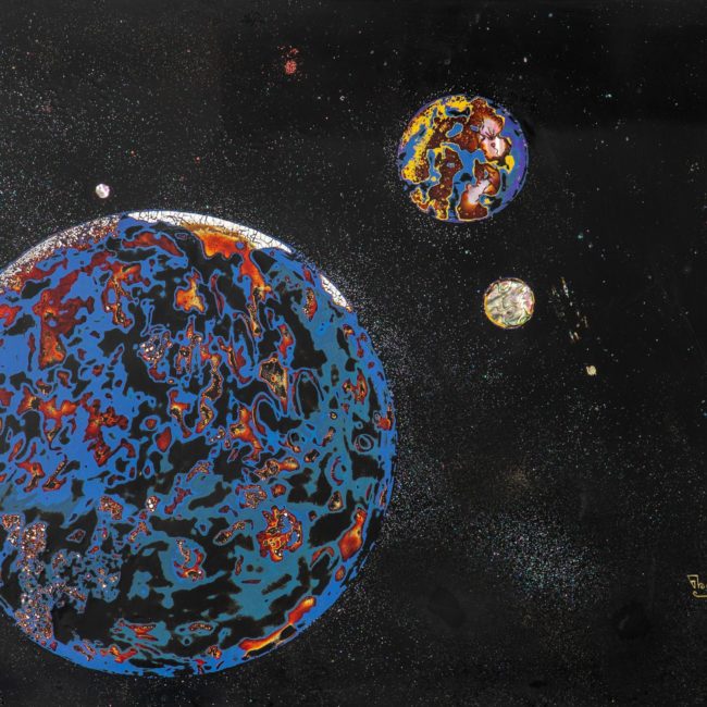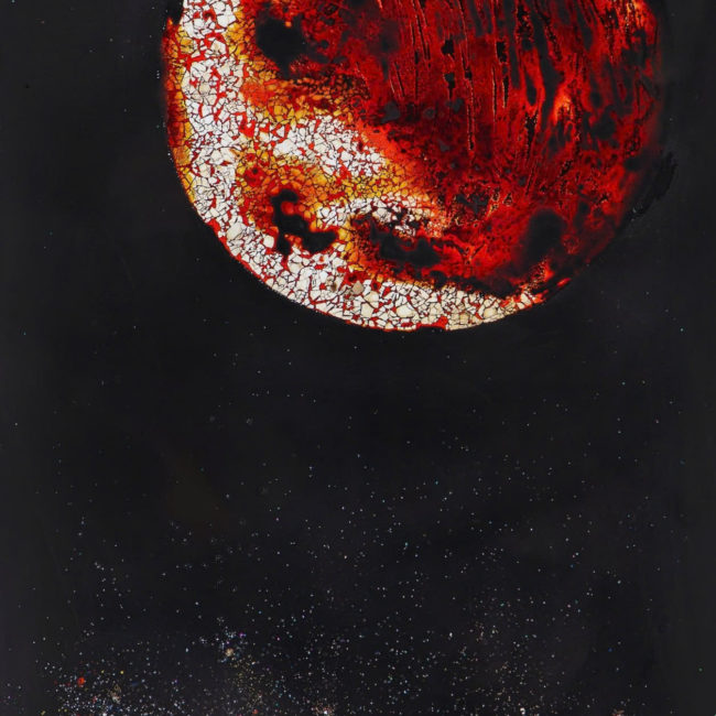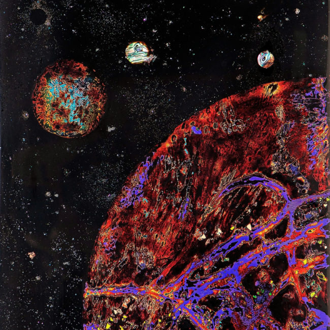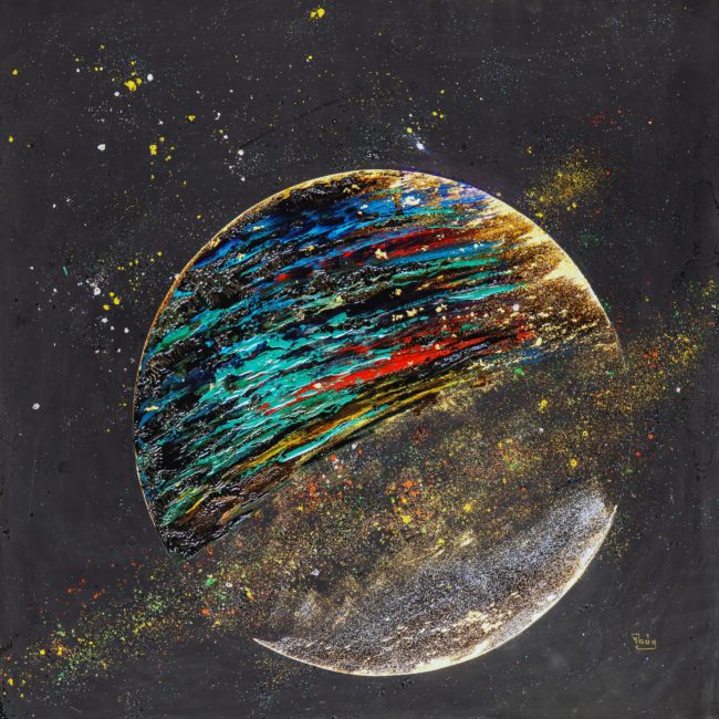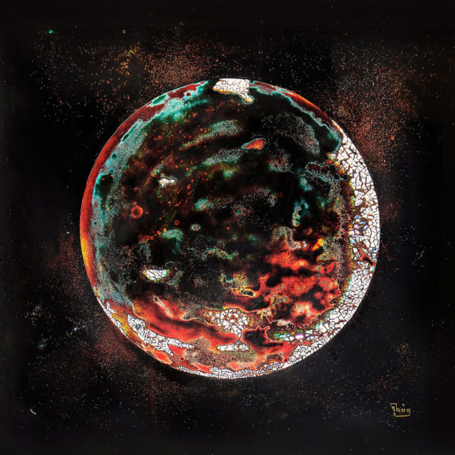 Thuy’s paintings are very much influenced by music and nature. You can see the orchestra of life created by a fun-and-stun process of using breathtaking and original techniques and materials. These include eggshell, mother of pearl, silver and gold leaves. These materials are rubbed with sand paper until the colours and textures burst out of the surface, layer by layer.